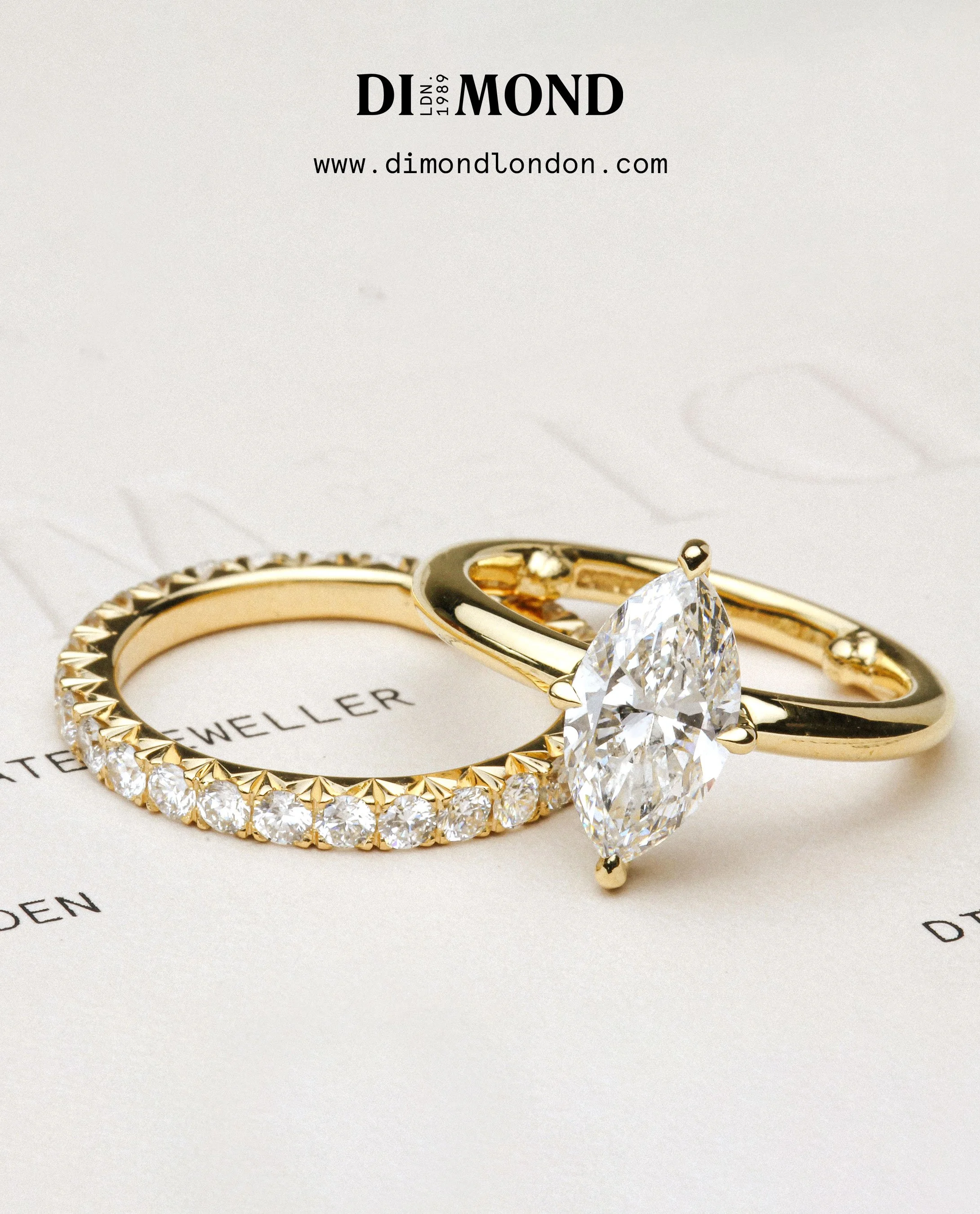 The marquise diamond has an elongated elliptical form featuring twin pointed tips. Originating in France during the 18th century, there’s a tale attributing its name to the Marquise de Pompadour, a mistress of King Louis XV, as it is said to mirror the contour of her lips. The unique silhouette of the marquise diamond elongates the finger to create a slenderising effect. Marquise diamonds can be set horizontally and vertically, and we often use them as accent stones in our designs.